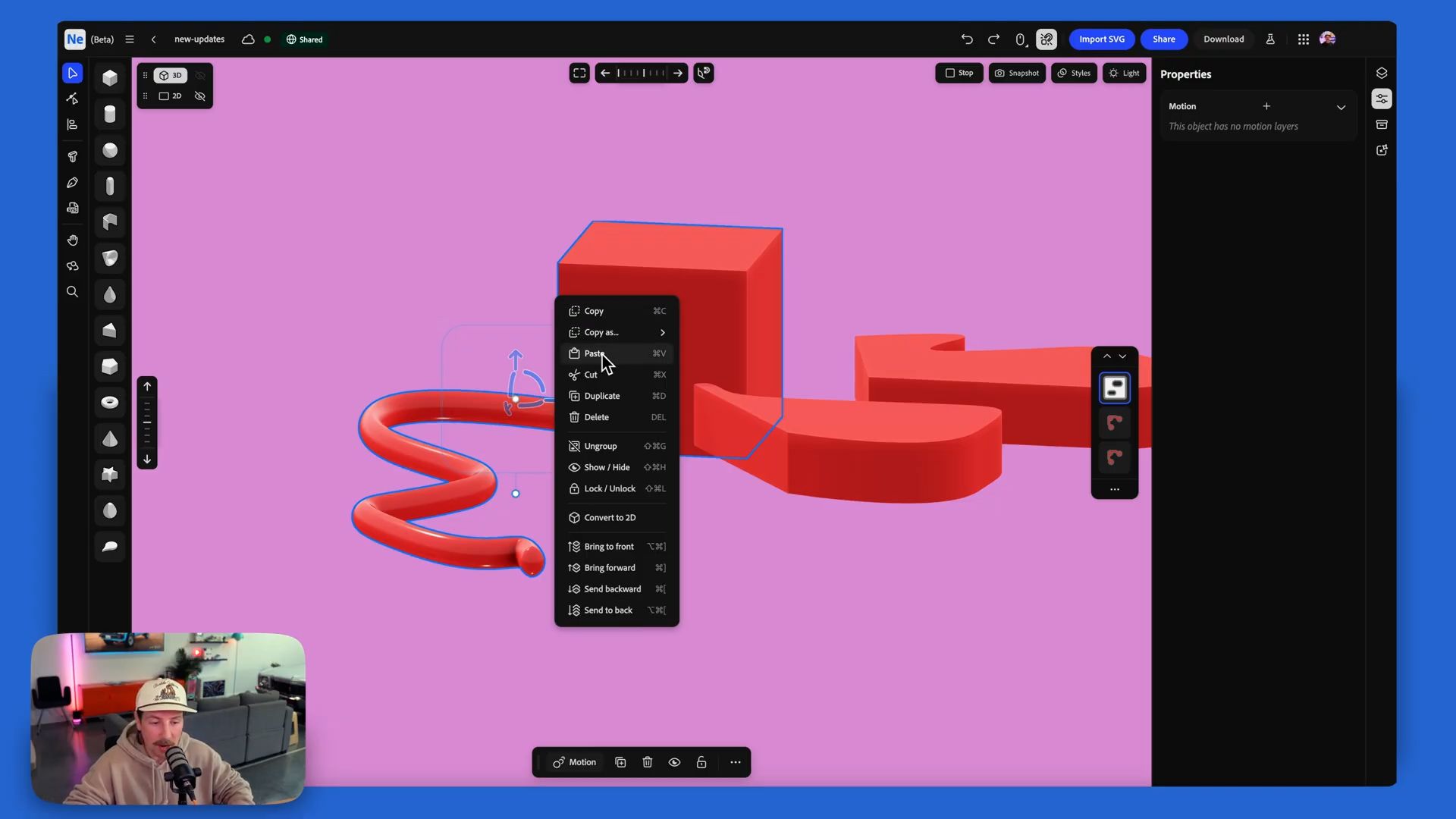 Pen tool: You can now draw freeform curves directly in Neo, with full control point behavior and live visual feedback as you build paths. Shapes drawn in the 2D layer can also be converted directly to 3D (no more round-tripping through Illustrator to get custom organic shapes into your scene).