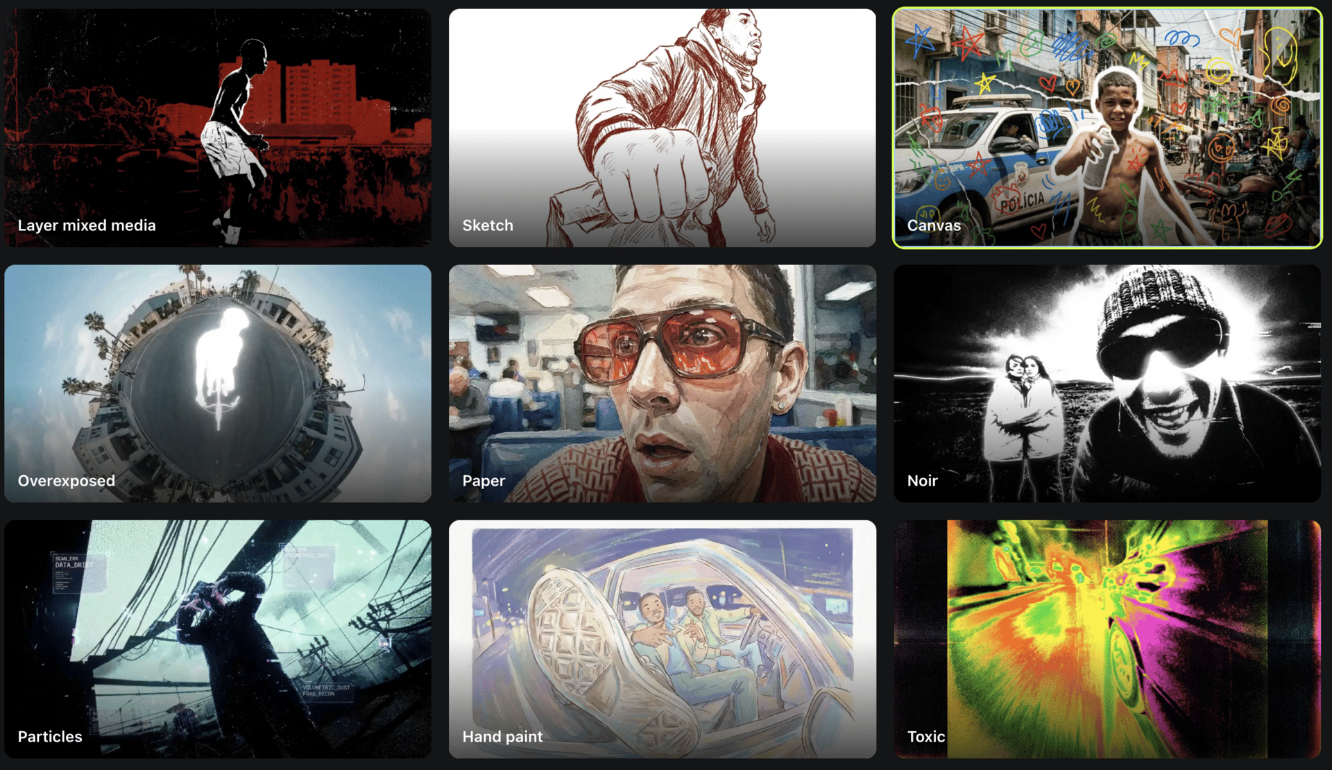 Transform footage instantly: Upload any video and apply 30+ preset styles (Sketch, Noir, Comic, Hand Paint, Vintage, LSD, Particles, and more) to create stylized edits in seconds.